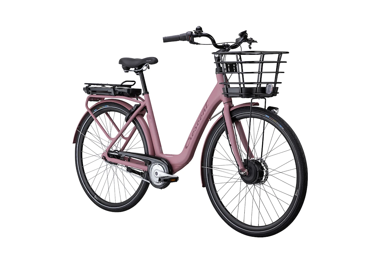 En komplett citycykel med korg och fotbroms.